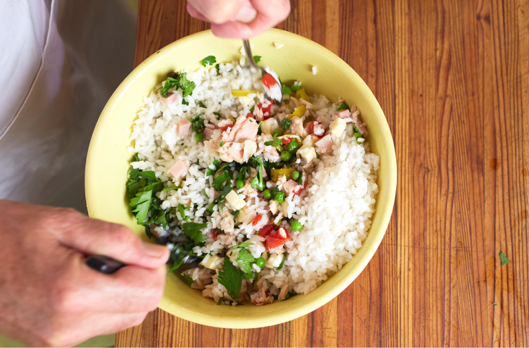Rice was introduced to Italy in the 1500s but wasn’t grown on a large scale until the mid-1800s. Its connection to the summer holiday likely dates to Mussolini’s introduction in the late ‘20s of the “People's Trains of Ferragosto,” cheap August train tickets to give the peninsula’s poor a chance for a vacation. The budget rail pass didn’t include the usual meal, so food that could travel for a day or two was packed for the trip. Traditionally made from a few pantry ingredients supplemented with cheese and salami, insalata di riso was perfect for the warm weather ride to the beach or mountains.