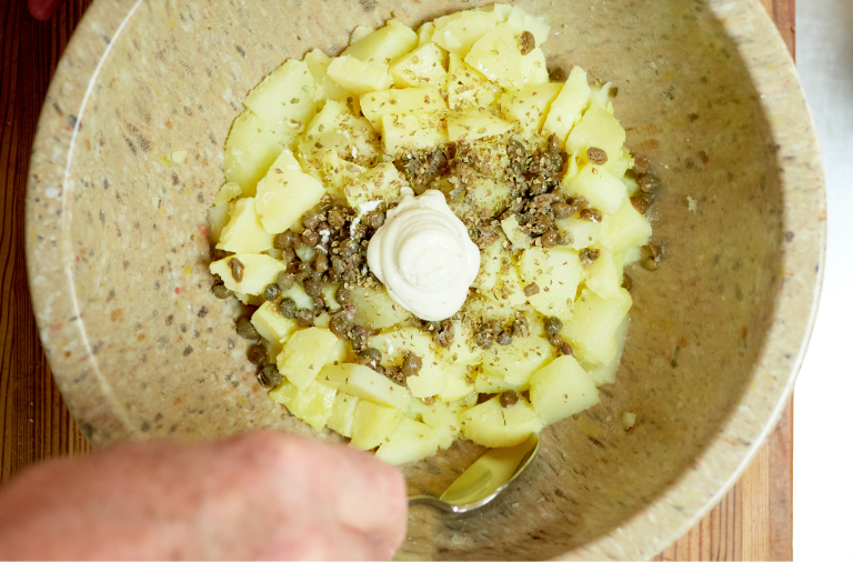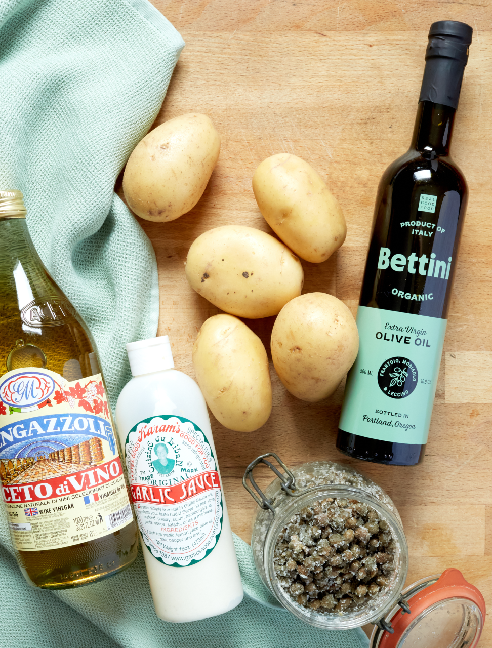 Yellow potatoes make the best salad. They’re moist, slightly waxy, and less prone to the mealy breakdown of Russets. And as much as I love the simplicity of Hazan’s salad, I like to bump up the flavor just a bit with a few more ingredients that still fit the Italian model.