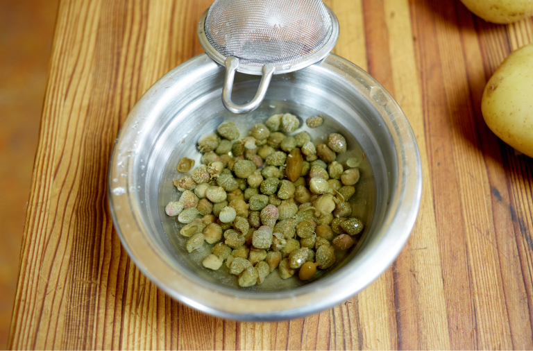 Soak 1/4 cup capers in cold water for 10-15 minutes, then drain and rinse off any excess salt. Chop coarsely.