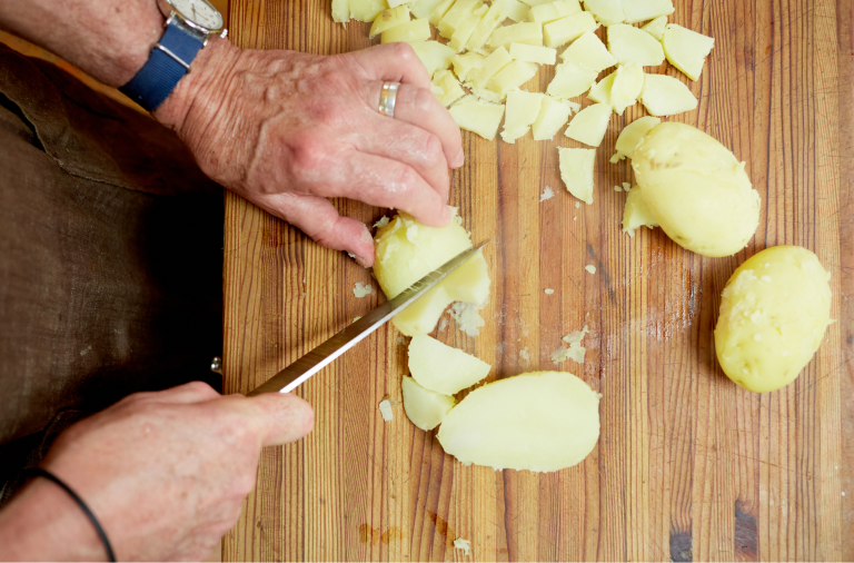 Boil the potatoes in their skins until they’re easily pierced with a knife. Drain, cool until you can handle them, but peel while they’re warm. Cut into bite-sized pieces and toss with 3 tablespoons vinegar.