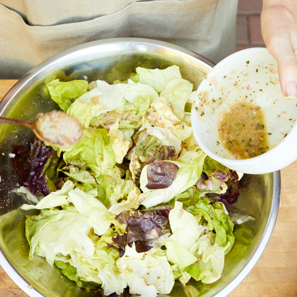 Step 1 – To make the dressing, whisk together ¼ cup vinegar, shallot, garlic, mustard, thyme, ½ teaspoon salt and ¼ teaspoon pepper. In a slow and steady stream add ⅔ - ¾ cup olive oil to emulsify.