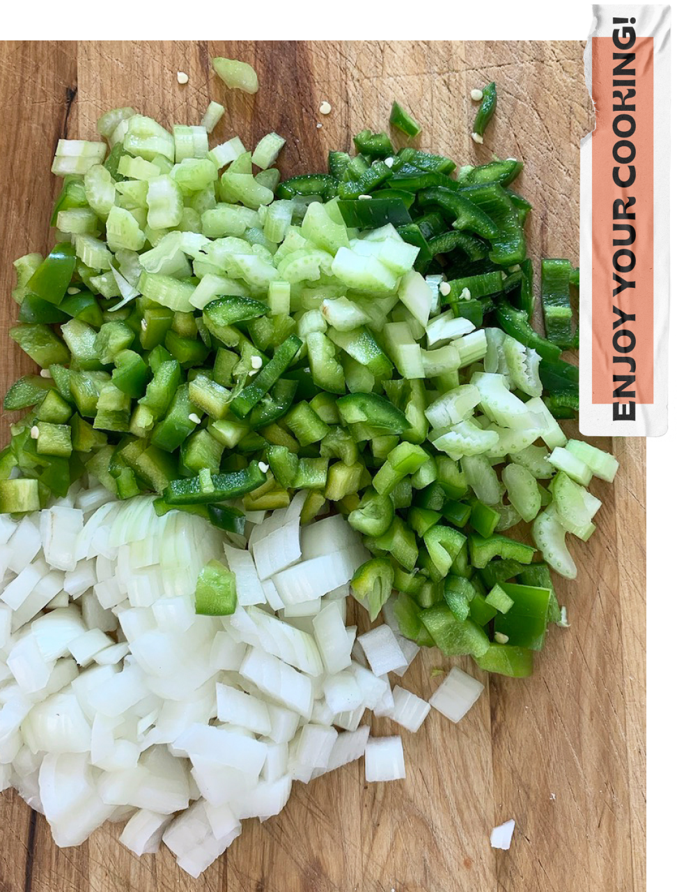 Chop an onion, green bell pepper, jalapeño, a couple of celery stalks,