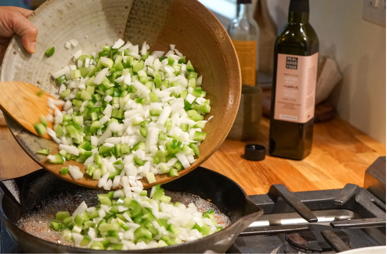 Add the onion, celery, bell pepper, and shrimp. Add the salt, pepper, chili, and thyme; cook until the vegetables are soft, about 10 minutes.