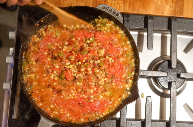 Add the corn kernels and garlic and cook for about 10 minutes. Add the grated tomatoes, reduce the heat, and simmer for another 5 minutes.