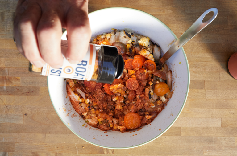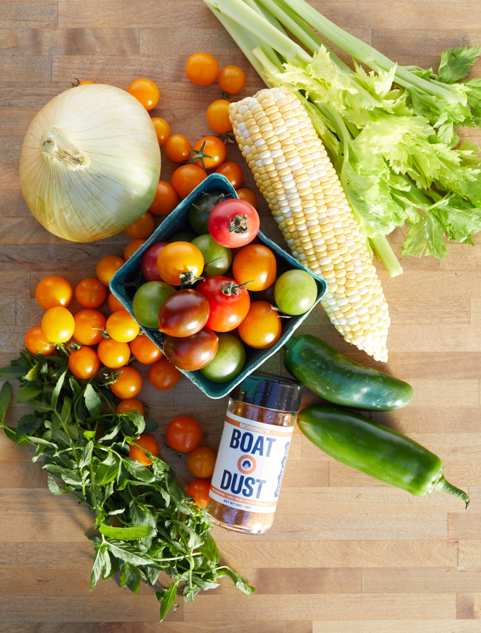 Inspired by Cajun maque choux, this salad combines sweet corn with cherry tomatoes and herbs with a little kick from Bobbie’s Boat Dust.