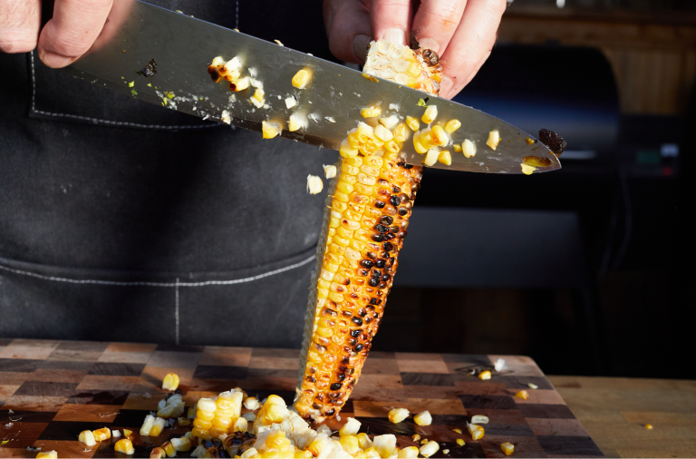 Shuck the corn and grill it over direct heat until the kernels get lightly charred. At the same time grill the onion halves and jalapeño until they soften and are also lightly charred.