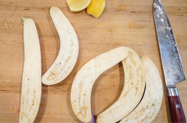 Stripe peel the eggplant, leaving some skin. Cut the eggplant in half lengthwise and slice a diamond pattern on the cut side of the eggplant. This allows the marinade to penetrate the eggplant and helps it cook more evenly.