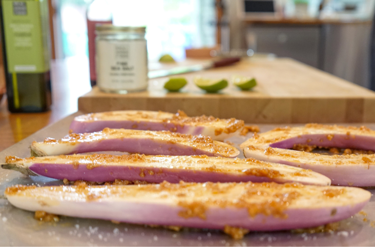 Brush the eggplant in the marinade, using just enough to moisten the eggplant, reserving the rest. Let sit for at least thirty minutes and up to 3 hours.