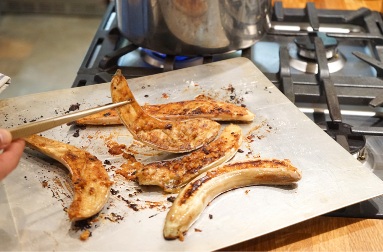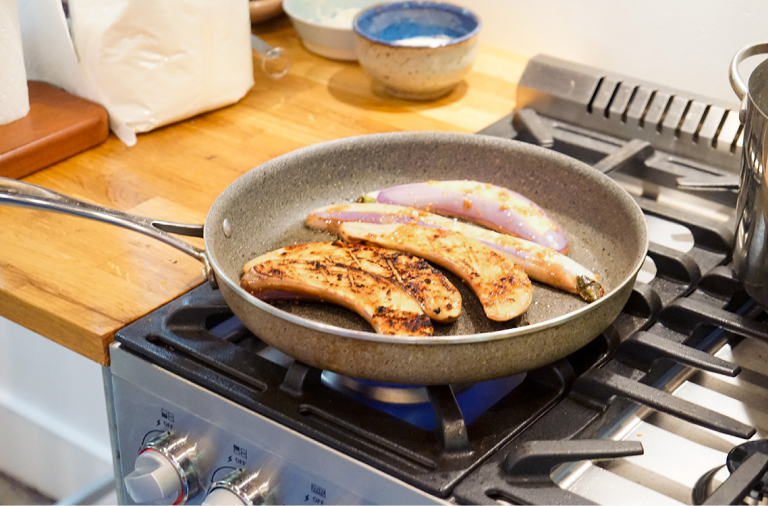 Heat a pan wide enough to fit the eggplant on medium heat. Add a splash of oil to the pan and wait for it to shimmer. Sear the eggplant on the cut side first. When they’re brown and caramelized, turn over to cook the skin side, adjusting the heat if needed so they don't color too quickly. You may have to do this in batches depending on the size of your pan.