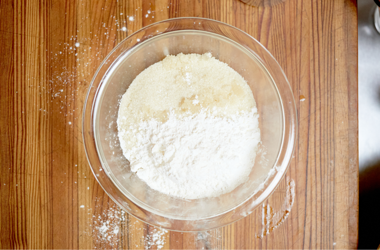Heat your oven to 350F. Mix the 2 cups sugar, 2 cups flour, 1/2 teaspoon salt, and 1 teaspoon baking soda in a large bowl.