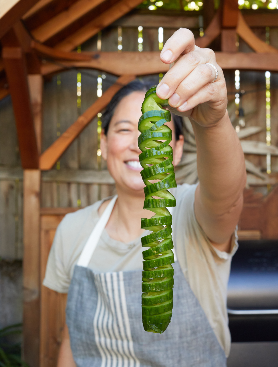 Step 1 – Cut your cucumbers into your desired bite-size shape. You can do spiral (see below), simple slices, or smashed chunks.
