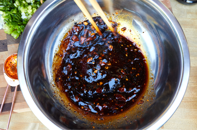 Step 3 – In that time, you can make the sauce: mix 2 tablespoons soy sauce, 2 tablespoons vinegar, 1 tablespoon chili crunch, 1 teaspoon sesame oil, 1 teaspoon honey, and peanuts.