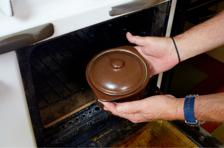 I use a ceramic bean pot, but anything with a lid that can go in the oven works. I rarely measure the beans or the water, but use roughly 3 cups of water for each cup of beans.