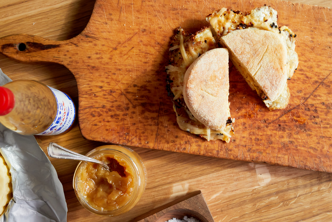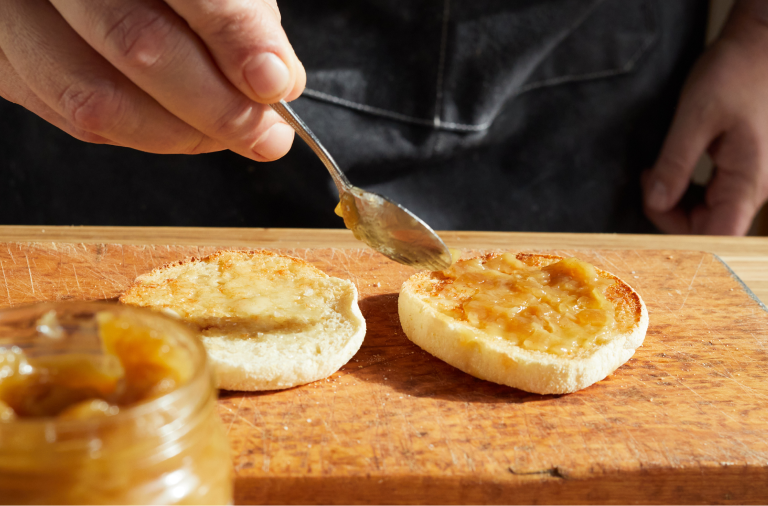 When the toaster pops, spread both sides of your English muffin with butter, then spread the onion jam on one side.