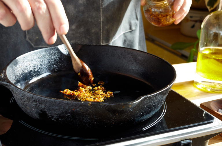 Set a cast iron pan over medium heat, then add 1 tablespoon of olive oil and 1 tablespoon of chili crunch. Let that sizzle for a moment, taking care to not let the chili crunch burn.