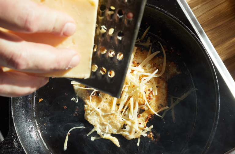 Grate a couple of tablespoons of cheese over the top (you can be a little reckless here: any cheese that spills over from egg edge to pan creates a deeply flavorful bit of crusty, cheesy lace). When the cheese is melted to your liking, remove the egg from the pan and transfer to your prepared English muffin.