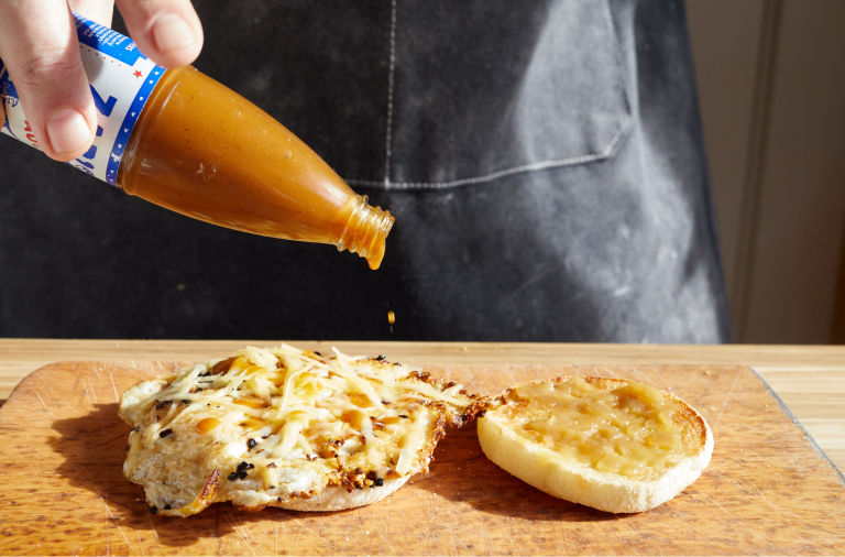 Place the egg on the “just butter,” side then drizzle with Zabs. Top with the other side of the English muffin and serve.