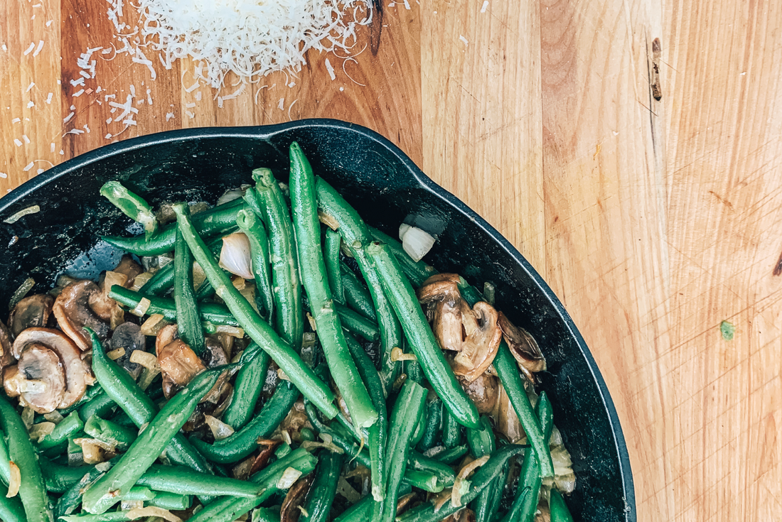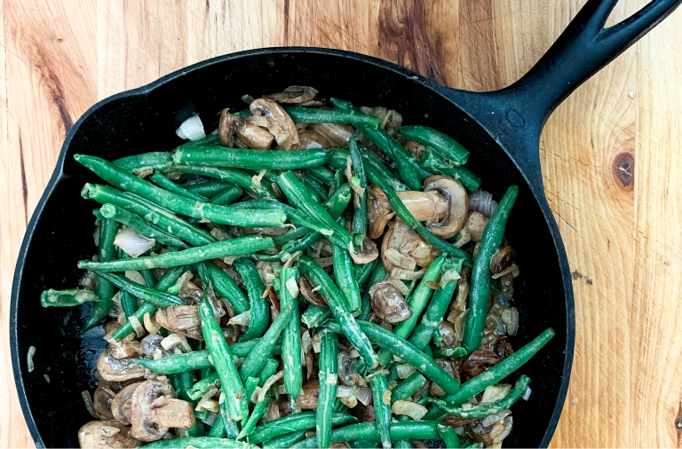 If your skillet’s big enough, mix in the green beans; if not, combine the beans and mushrooms in a baking dish. Stir it together and taste for salt, adding more if needed.