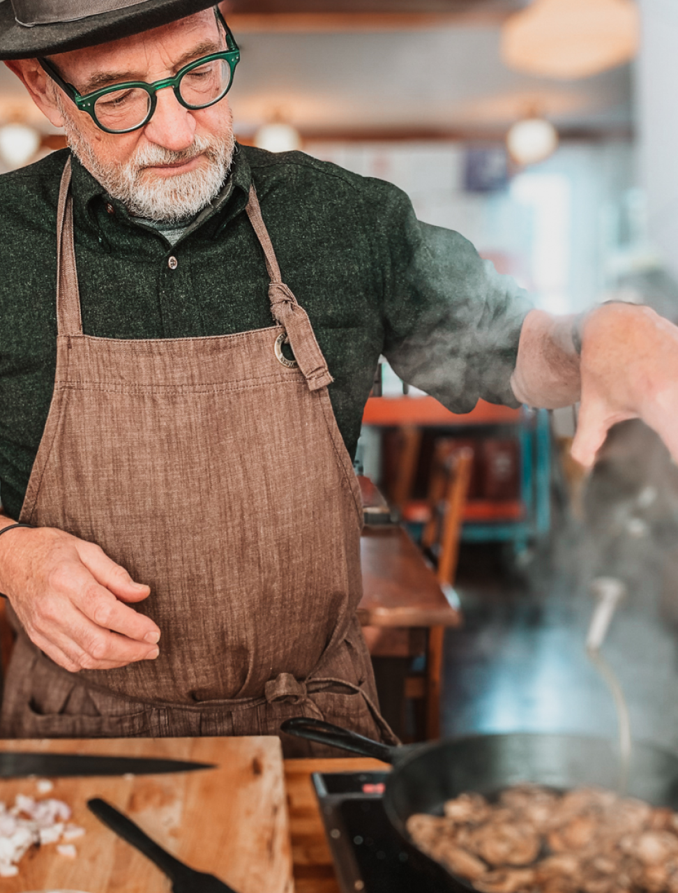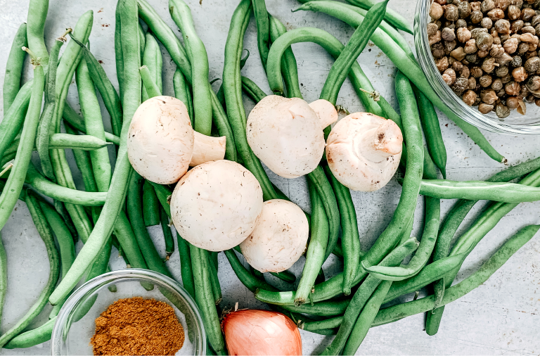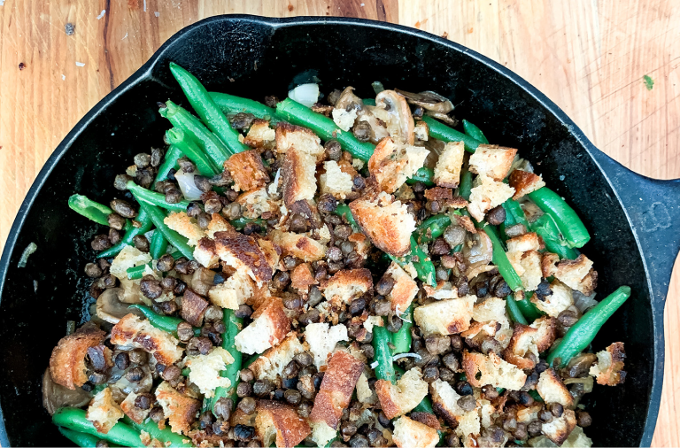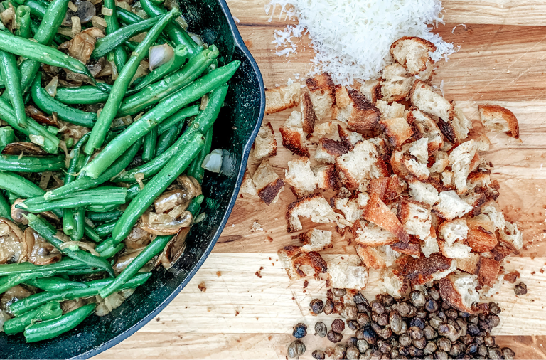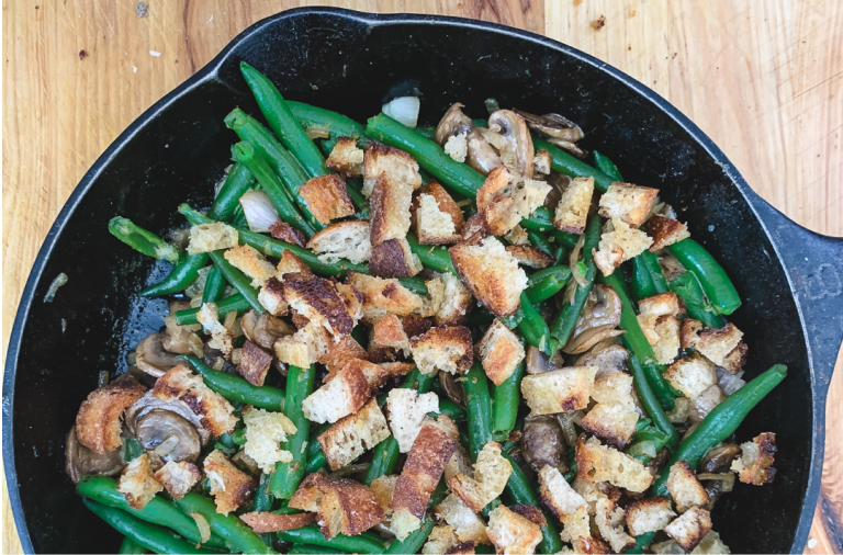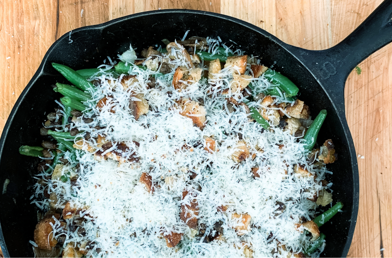 But this version tastes better. Fresh green beans and mushrooms in a silky cream sauce with a subtle flavor of the Mediterranean from North African spices. A mix of croutons, fried capers, and cheese make for a crispy topping that doesn’t come from a can.