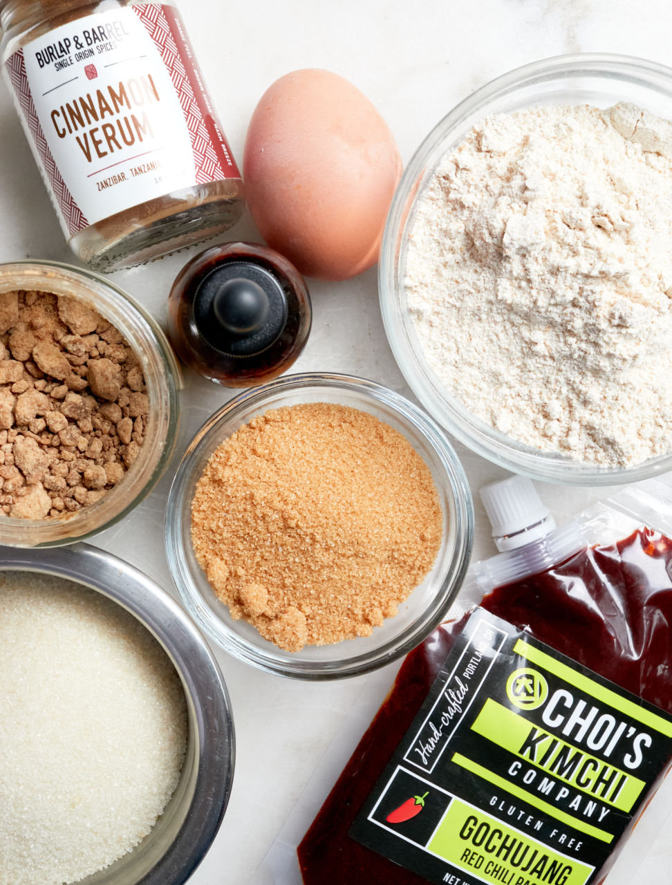 and shortly after reading I learned that Choi’s, our favorite kimchi producer, had introduced their own version of the fermented Korean chili paste called gochujang. So I made a few changes, including using extra virgin olive oil instead of butter of course, and used whole wheat flour to offset the inescapable fact that these are cookies.
