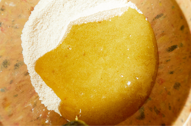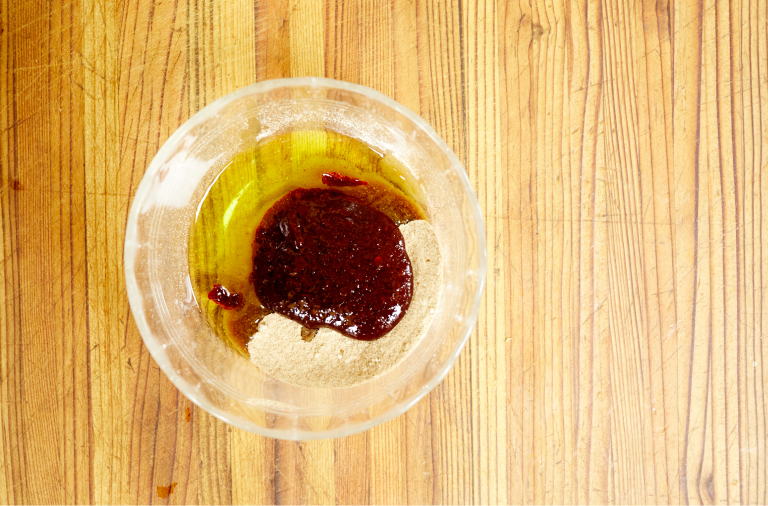 Mix together 1 tablespoon olive oil, 2 tablespoons Okinawan sugar, and 1 1/2 tablespoons gochujang and set aside.