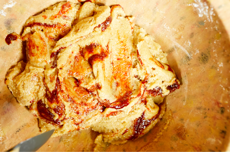 Let dough come to room temperature, and add small spoonfuls of gochujang mixture, swirling it in without mixing completely so streaks of red are still visible.