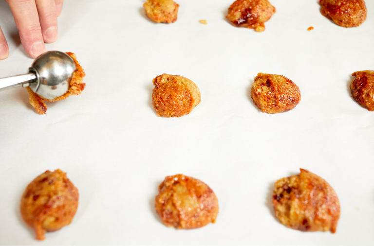 These cookies will spread a lot, so use a 1 oz scoop (or a spoon to make balls slightly smaller than walnuts) to drop the dough onto a cookie sheet, and give plenty of room. Bake at 350F for 11-13 minutes or until beginning to brown, then transfer to a wire rack and let cool completely.