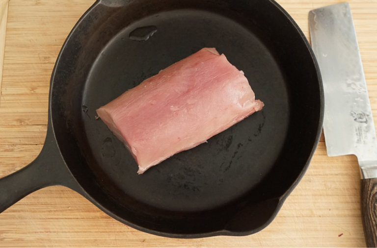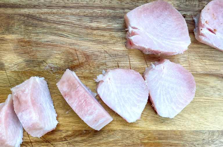 While they’re still partially frozen, cut the albacore loins across the grain about 2 inches thick, then let thaw completely. (The fillets are called loins since they have the same shape as a pork loin, but only humans and quadrapeds actually have loins.)