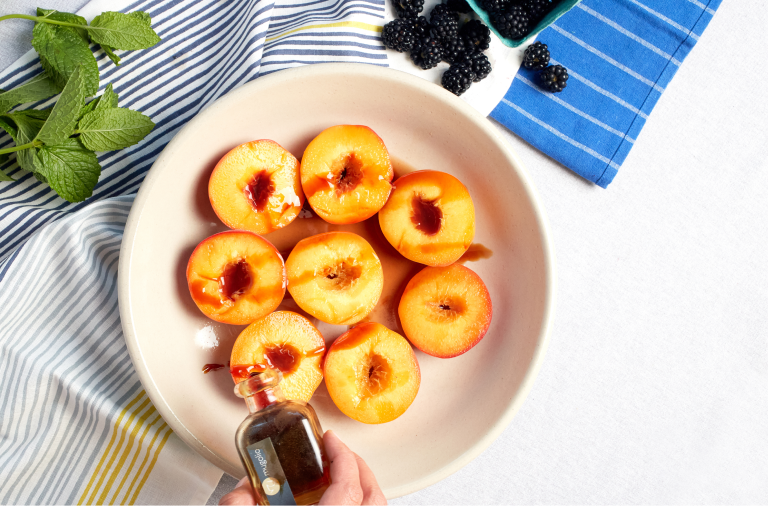 If I want something that seems sophisticated, I roast peaches in sweet vermouth. The herby, slightly bitter vermouth plays well with the sweet, acidic fruit, and a drizzle of the Italian syrup made from the buds of the dwarf mugo pine gives the peaches a subtle, evergreen finish. Blackberries ripen around the same time as peaches, so add a few along with some fresh mint if you’ve got them.