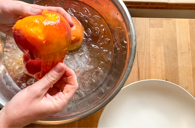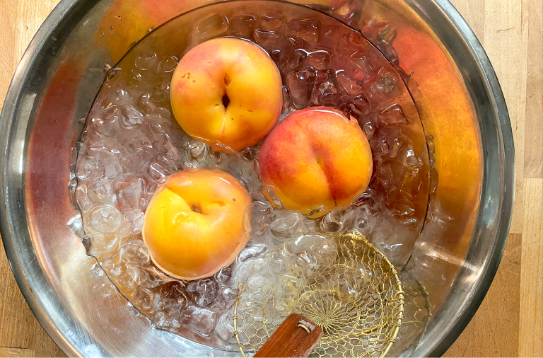 I don’t peel the plums, but peach skins get tough when cooked. A serrated edge swivel peeler will do the job, but the quickest and easiest method is dropping the fruit into boiling water for about a minute. Do a few at a time, lifting them out of the water with a slotted spoon; transfer to a bowl to cool, then slip the skins off.