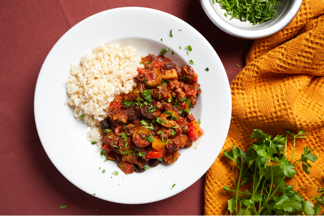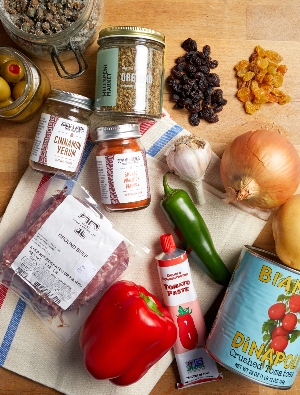 Our picadillo borrows from them all. We like the jalapeño heat from Mexico, the salty capers used by Cubans, and, in a nod to the original, the sherry-like rancio sec wine from the Pyrenees.