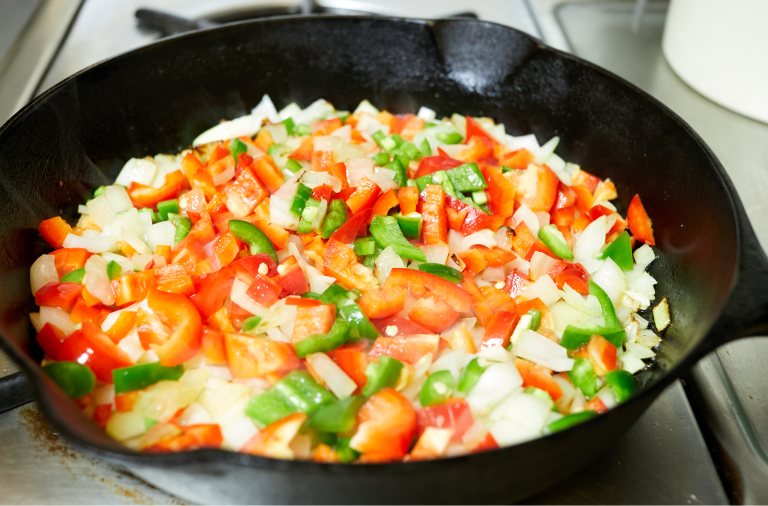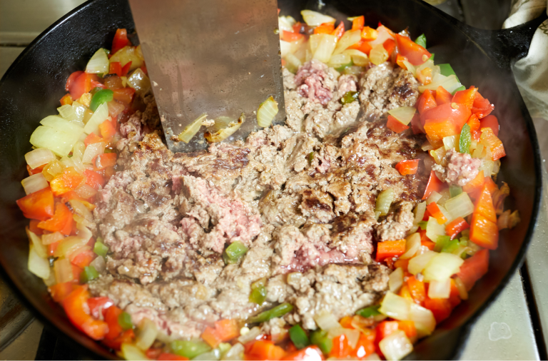 Move the vegetables to the edges of the skillet and add the ground beef, pressing it down to fill the center of the pan. Cook undisturbed for about 5 minutes or until nicely browned, then break it up with a spatula.
