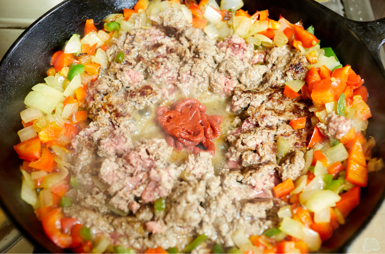 Clear a spot in the skillet and add the tomato paste. Let it cook undisturbed for about 2 minutes or until it’s beginning to darken. Stir into the beef mixture.