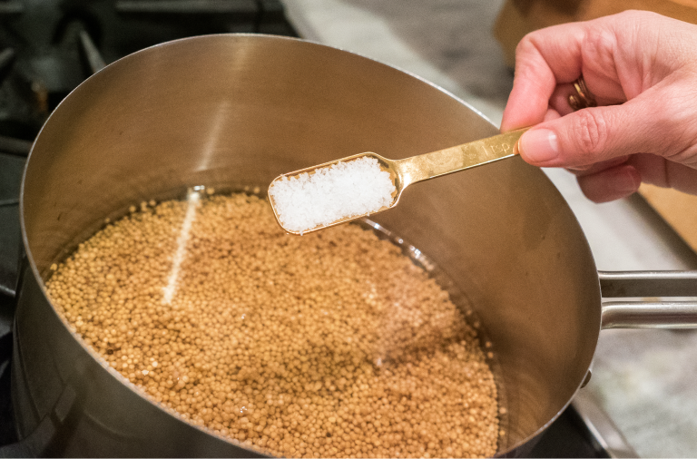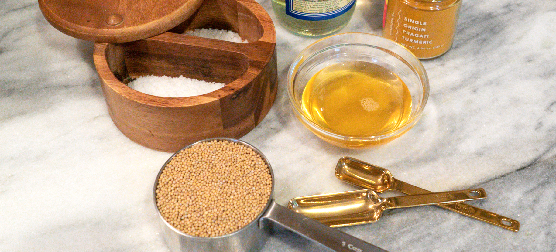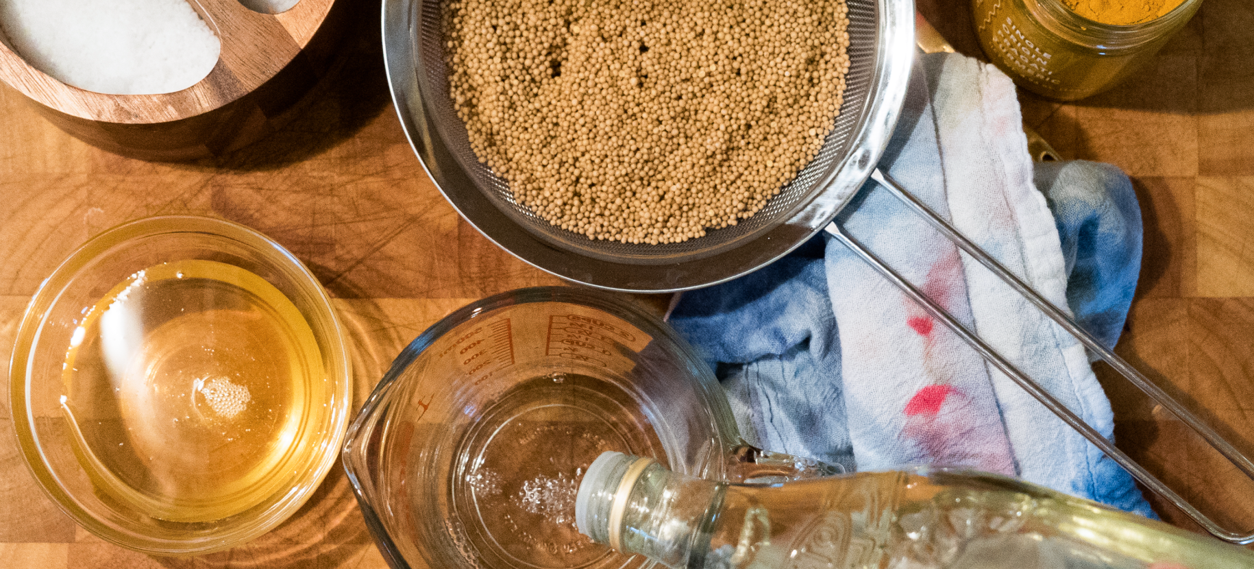 Step 1 — Rinse 1 cup mustard seeds in a fine strainer under your faucet. Combine 2 cups vinegar and 1 teaspoon salt in a medium stainless saucepan, add rinsed mustard seeds. Allow to soak at room temperature for at least 1 hour, up to overnight. This step is optional but makes for plumper more flavor seeds in the end.