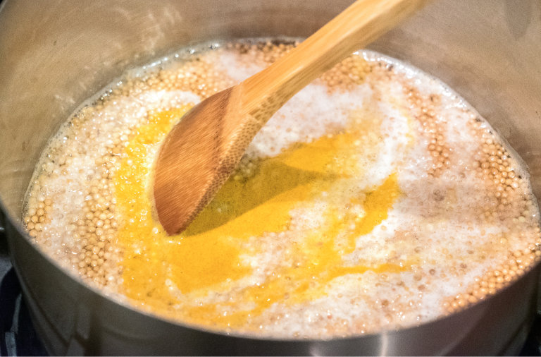 Step 3 — Heat on the stove on medium until simmering. Stir frequently and keep at a simmer. Cook it for about 20 minutes. You will notice that the mustard seeds have plumped up and the consistency has thickened a bit similar to cooking grits.