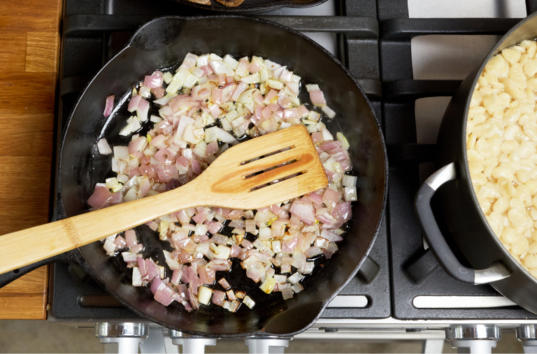 Heat a heavy skillet on medium heat to cook the other red onion with a pinch of salt in 3 tablespoons of olive oil. Cook, stirring occasionally, until the onion is deeply caramelized, at least 30 minutes. Add a little water if the onion looks like it’s burning but isn’t completely browned.