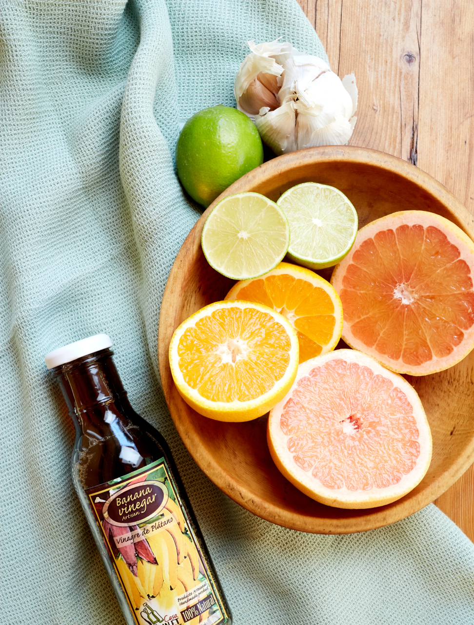 Combine 1/2 cup lime juice, 1/2 cup orange juice, 1/2 cup grapefruit juice, 1/2 cup vinegar, and 10 cloves garlic in blender (or mash the garlic using a mortar and pestle, then mix with juice). Pour over the pork and marinate for at least 2 hrs or overnight.