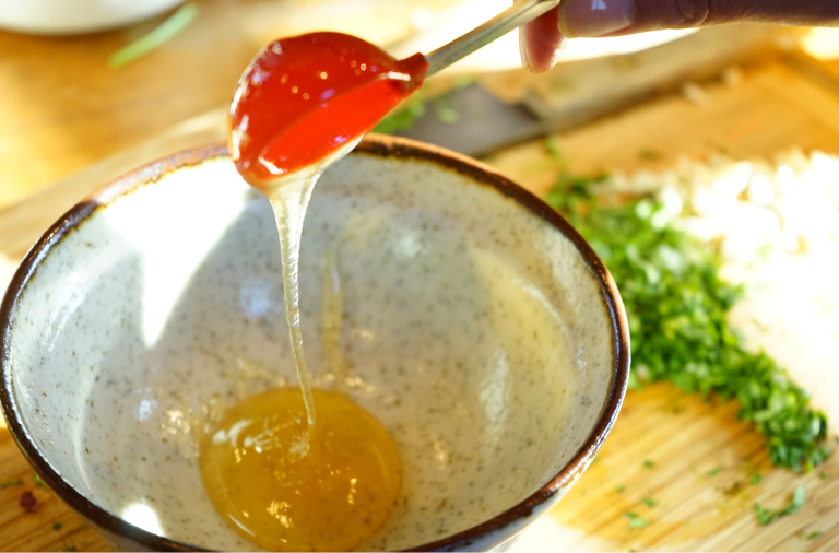 Dissolve 1 tablespoon of honey and 1/2 teaspoon of salt in 2 tablespoons of vinegar, then mix in 4 tablespoons of oil. Add 1 teaspoon of cumin seeds, garlic, black pepper, and cilantro (and red pepper, if using).