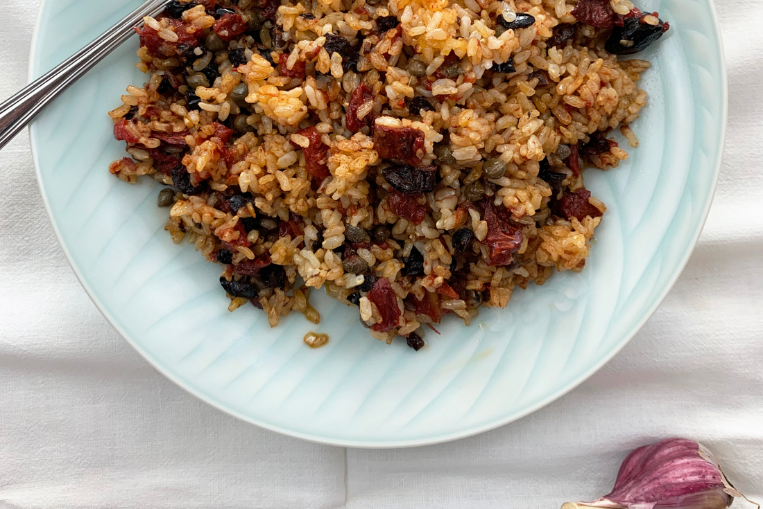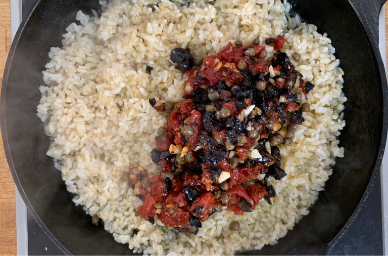 Stir in the sauce, which will be salty from the olives and capers, and taste the rice, adding more salt if needed. Remove from the heat and sprinkle with chopped parsley; serve with Burlap and Barrel silk chili for a little extra heat.