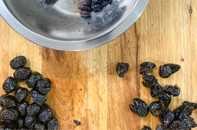 Squeeze the pits from about a half cup of oil-cured olives and chop coarsely.