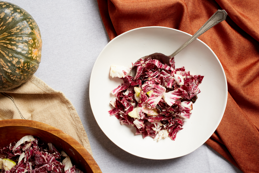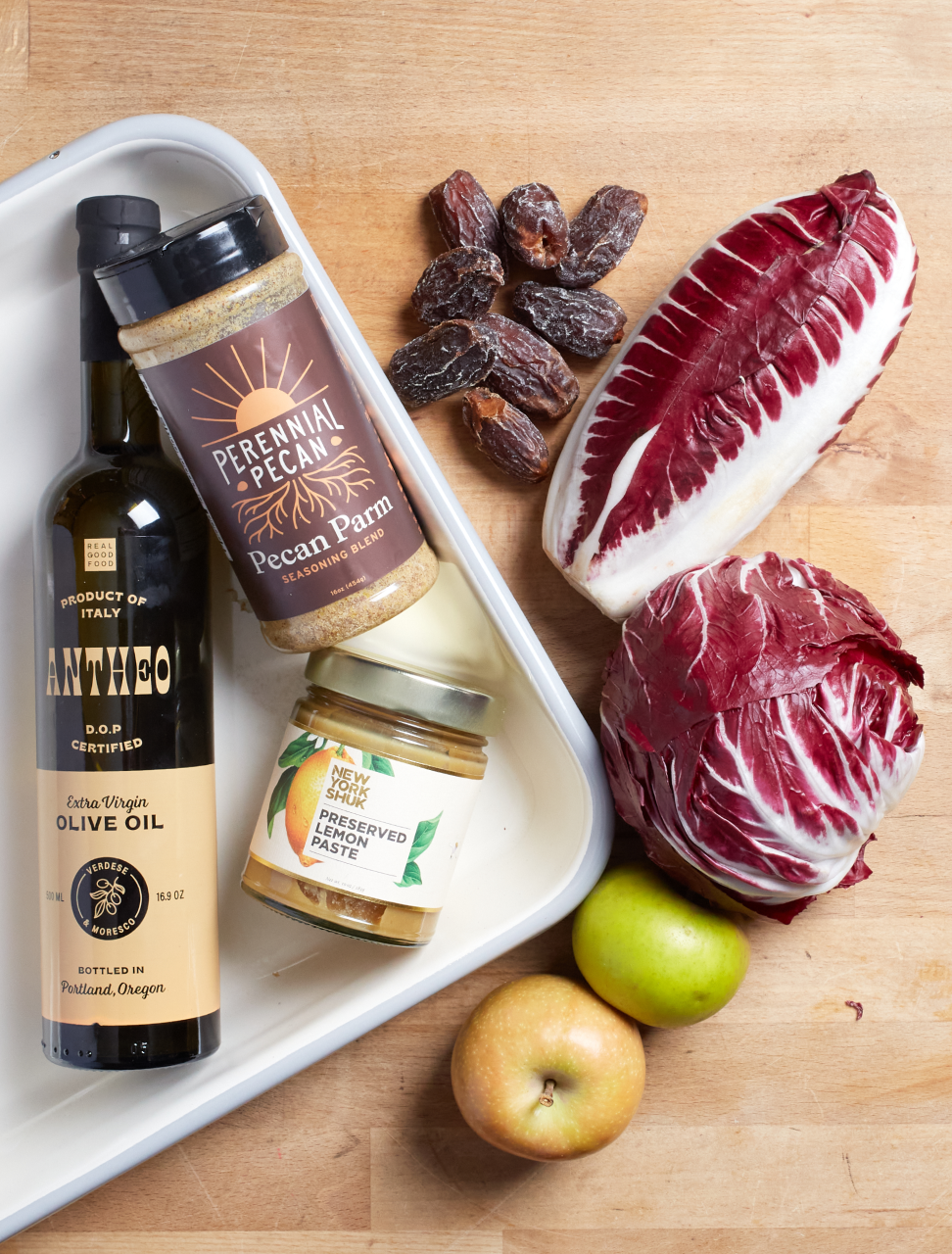 Toss the radicchio, apple and dates with the dressing. Taste and add salt if needed.