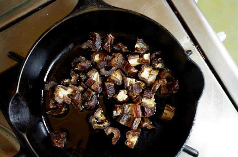 Remove the pits from the dates and cut into 1/2 inch pieces. Cook in 1 teaspoon of olive oil over medium heat until lightly browned and a little crispy, from 5-10 minutes.