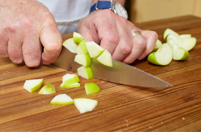Cut the apple into quarters, remove the cores, cut each quarter in half, and slice into bite-sized pieces.