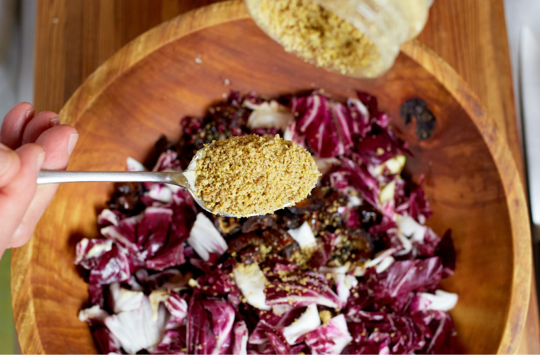 Any of them work in this salad. The mildly bitter flavor is balanced with sweet caramelized dates, crunchy slices of apple, tart preserved lemon, and creamy tahini. Nutritional yeast, adds a parmigiano-like umami to the dressing.
