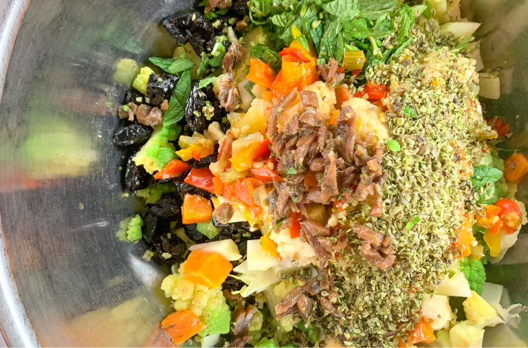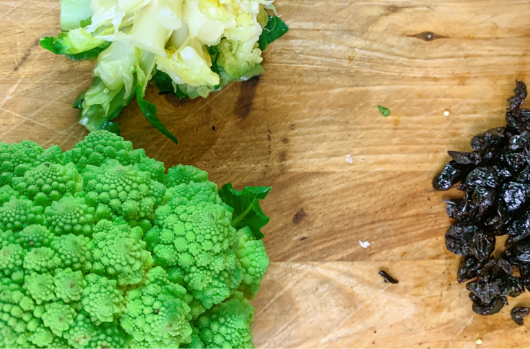 Combine the chopped romanesco with the other ingredients, taste and add salt as needed. While you can eat the salad right away, it’ll be better if allowed to rest for at least an hour.