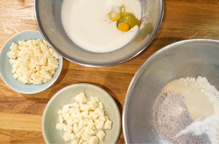 In a separate bowl, whisk together buttermilk, eggs, and melted butter. Fold the wet ingredients into the dry using a rubber spatula. Then, fold in the corn and cheese curd.