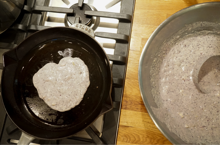 Don’t overcrowd, the batter will spread out a little bit. When you start to see bubbles coming through the pancake, check the bottom.
