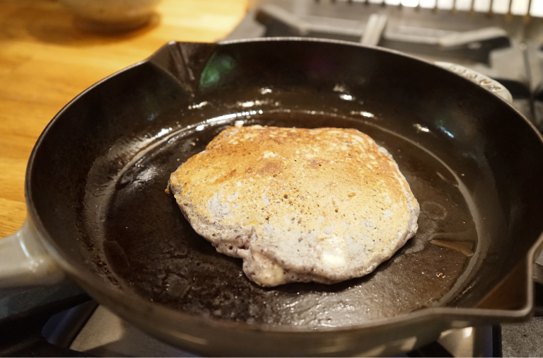 Heat cast iron pan on medium. Put a tiny bit of butter or a few drops of oil in the pan and rub with a paper towel. When hot, ladle 3 oz batter into the pan.