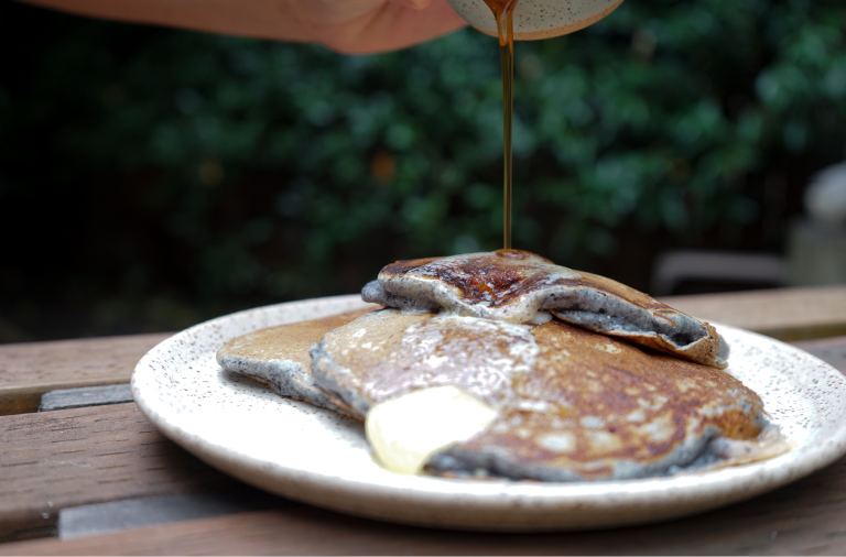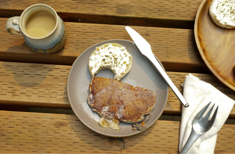 While he’s known for his innovative, Middle Easternish food from his days as the chef at Tusk, Sam Smith makes a mean pancake. Made with a blend of flour and Ayers Creek cornmeal and studded with fresh corn kernels, these can go from sweet to savory with a couple of minor tweaks.