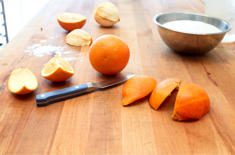 Cut the nubby ends off each orange, slice the oranges into four quarters lengthwise, and separate the flesh from the peel (you can eat these or squeeze out the juice).